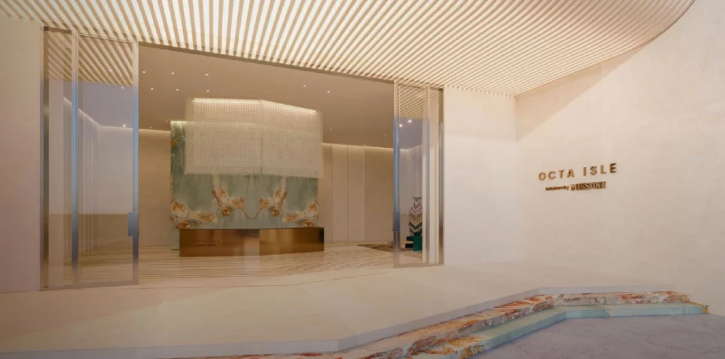 The façade of Octa Isle Interiors by Missoni is inspired by its coastal setting, integrating light, texture, and vibrant colours. Distinctive Missoni design elements—custom mosaics, rich tones, and innovative shading technology—blend timeless artistry with modernity, ensuring a one-of-a-kind living environment.